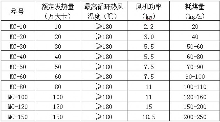 7、發(fā)熱量從5萬大卡至300萬大卡不等。不同型號爐體按物料的要求和烘干量的多少選擇配套。